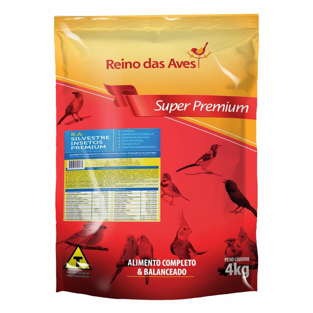Milho Pré-Gelatinizado(1), Dextrose, Farelo de Soja(2), Ovo Integral Desidratado, Aveia sem Casca, Crisálida Desidratada (mín 1,5%), Linhaça, Níger, Perilla, Trigo Grão, Chia, Sal Comum, Extrato de Levedura, Farinha de Ostra, Maçã Desidratada, Enzimas (Mín 0,15% - Mistura de Pectinase, Protease, Fitase, Betaglucanase, Xilanase, Celulase e Amilase), Vitamina A, Vitamina D, Vitamina E, Vitamina K, Vitamina B1, Vitamina B2, Vitamina B6, Vitamina B12, Niacina, Ácido Pantotênico, Ácido Fólico, Biotina,