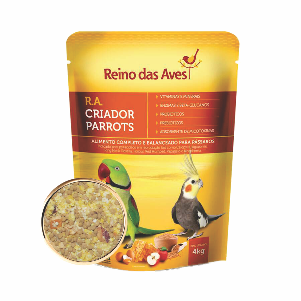 ALIMENTO COMPLETO E BALANCEADO INDICADO PARA PSITACÍDEOS EM REPRODUÇÃO TAIS COMO: CALOPSITA, AGAPORNE, RING NECK, ROSELLA, FORPUS, RED RUMPED, PAPAGAIO E NEOPHEMA.