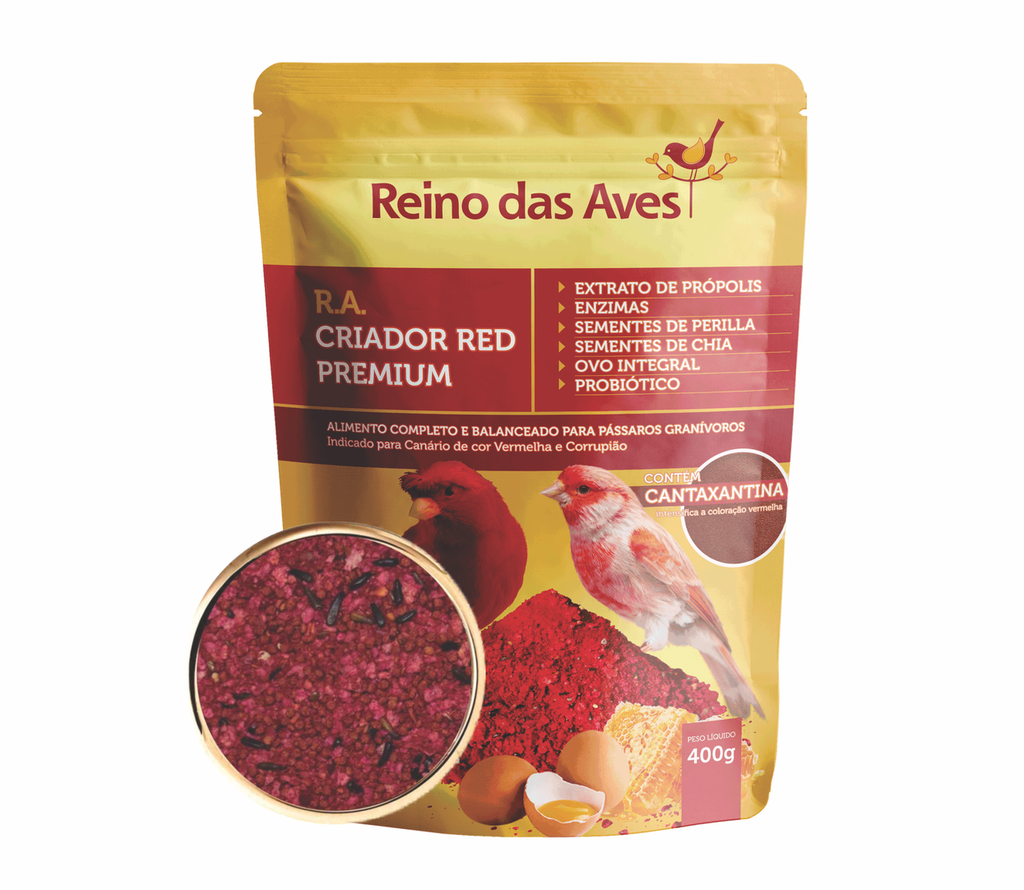 Alimento completo e balanceado para passaros granivoros, indicado para canário de cor vermelha e corrupião.